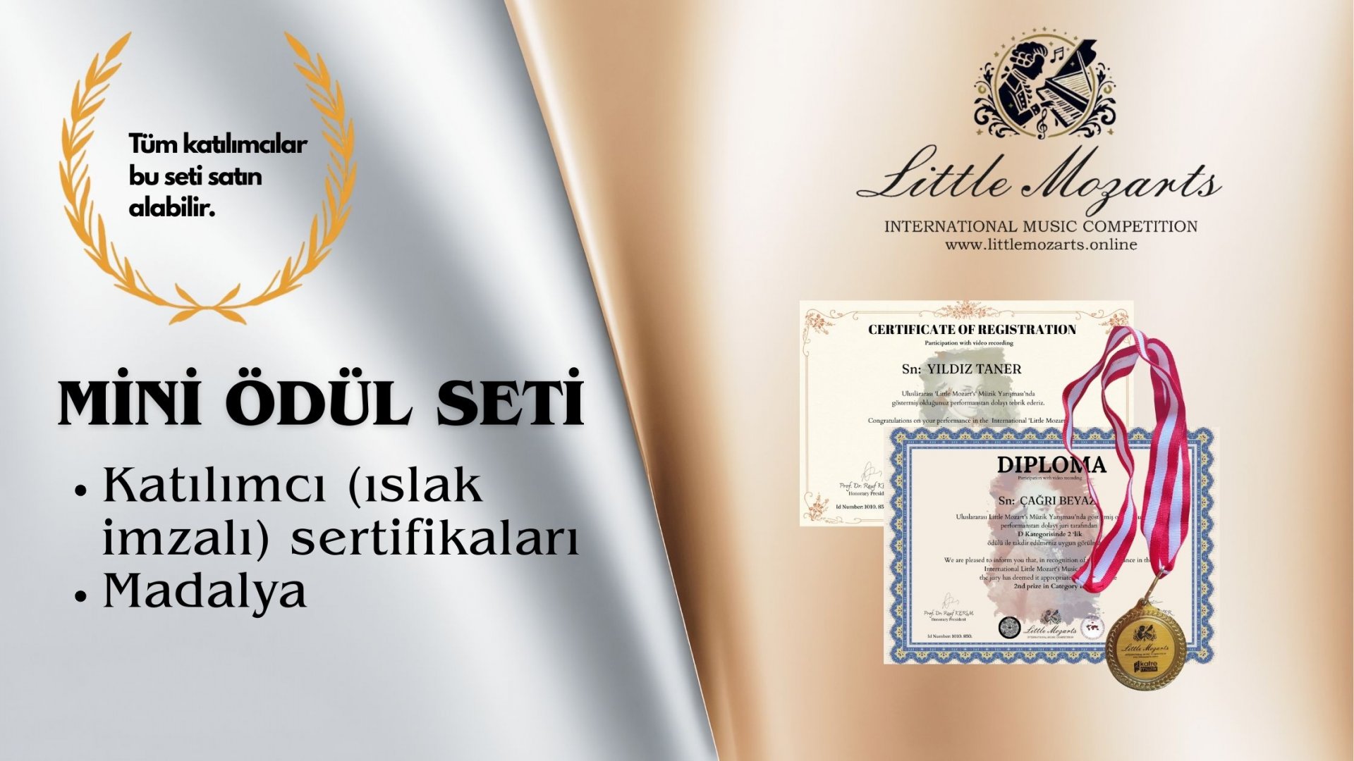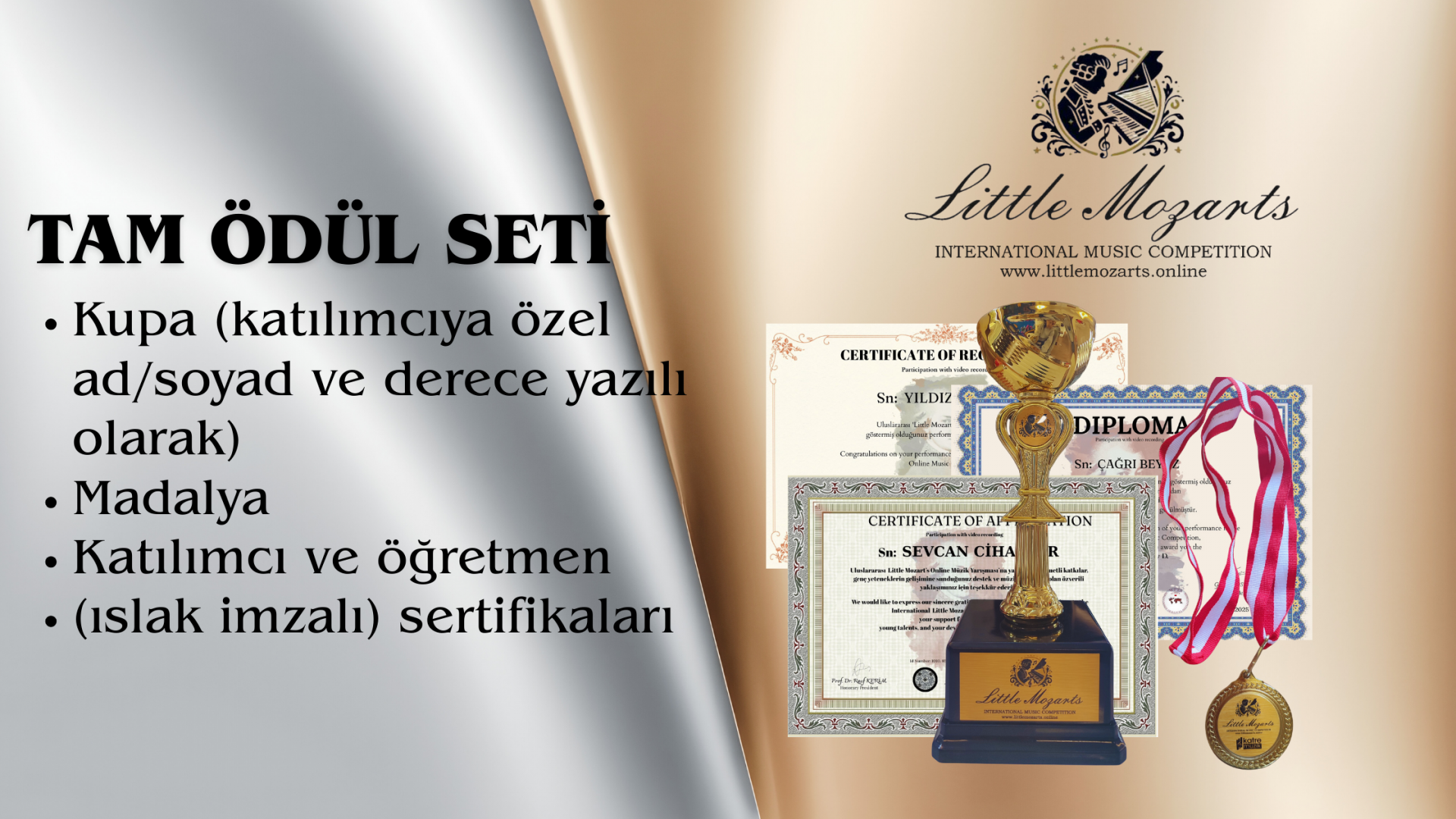 TAM ÖDÜL SETİ: MADALYA, BASILI TÜM SERTİFİKALAR, KUPA
